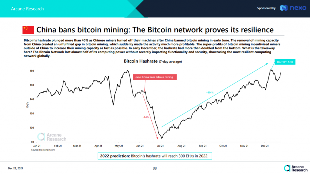 Aber selbst wenn es dazu kommen sollte, so hat das Bitcoin Netzwerk bereits im letzten Jahr, im Rahmen des Bitcoin Mining Verbots durch die chinesische Regierung, seine Widerstandsfähigkeit eindrucksvoll unter Beweis gestellt. Nachdem die Bitcoin-Hashrate im Juni um mehr als 40 % gesunken ist, so hat sich diese von ihrem Tiefpunkt aus bis Ende des Jahres mehr als verdoppelt.