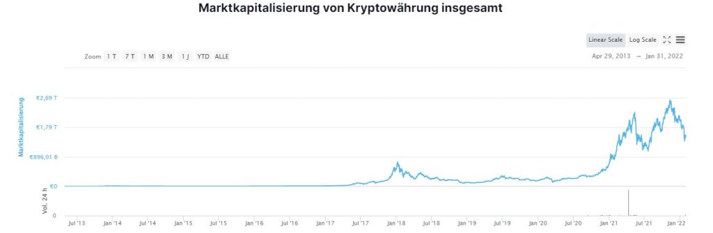 Angeführt vom Bitcoin, der seit seinem Allzeithoch im November fast 50% im Wert gefallen ist, sank die gesamte Marktkapitalisierung aller Kryptowährungen von 2,94 Billionen US Dollar auf 1,59 Billionen US Dollar. Das entspricht einem Absturz von 46% in ca. zwei Monaten.