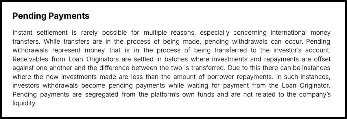 Essentially, these are funds that are in the process of being transferred to the investor’s account. The reason behind this is that claims against the lenders are handled in batch processes, where investments and repayments are offset against each other, and only the net difference is transferred. As a result, investor payouts are shown as “Pending Payments” until the lender’s payment has actually been received.