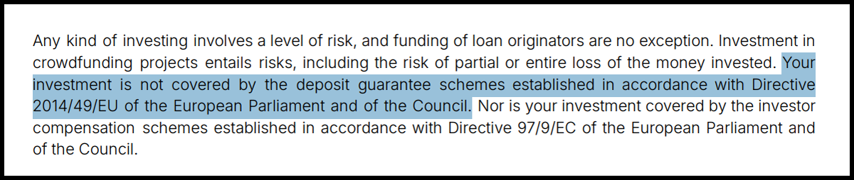 The investments offered through Lendermarket are not covered by European deposit guarantee schemes (such as the Deposit Guarantee Directive 2014/49/EU). This means that – unlike traditional bank deposits – funds invested on Lendermarket are not insured or guaranteed by any national or European compensation scheme.