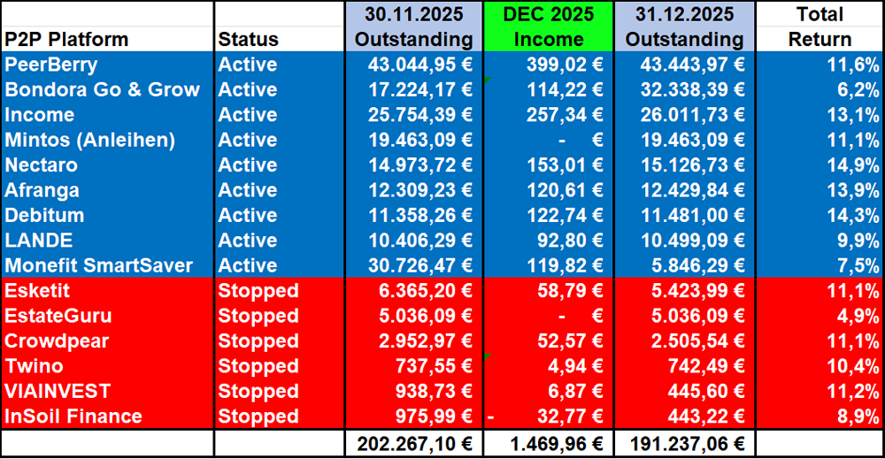 My P2P lending portfolio consists of my personal investments in the P2P environment. My active P2P portfolio is shown as well as my terminated investments. In addition, investors can find information about my current return, the investment start and the current investment status.