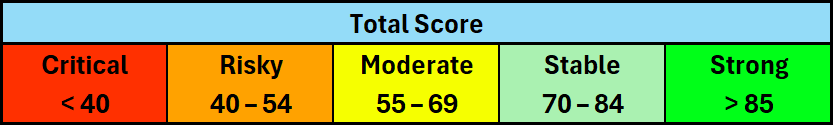 - Structure du Capital / Solvabilité (25%) : Composée du ratio de fonds propres (60 % ; 15 % du score total) et du ratio d’endettement (40 % ; 10 % du score total).