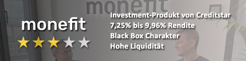 - Monefit SmartSaver ist eine Investment-Plattform des international-tätigen Fintech-Unternehmens Creditstar. Hier können Anleger direkt in das Kreditportfolio der Creditstar Gruppe investieren und dabei eine Rendite von bis zu 10,52% erzielen können. Der operative Start erfolgte Ende des Jahres 2022.