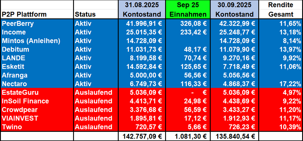 So sieht aktuell mein persönliches P2P Kredite Portfolio zum Zeitpunkt Ende September 2025 aus.