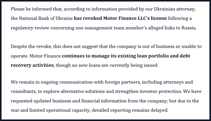 Debitum hat kommuniziert, dass dem ukrainischen Kreditgeber Motor Finance LLC die Lizenz von der Nationalbank der Ukraine entzogen worden ist. Grund dafür sei eine behördliche Überprüfung im Zusammenhang mit den angeblichen Russland-Verbindungen eines Mitglieds des Management-Teams gewesen.