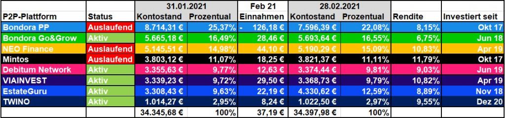 Zunächst eine Übersicht, wie sich mein P2P Portfolio im Monat Februar 2021 entwickelt hat.